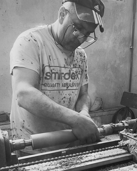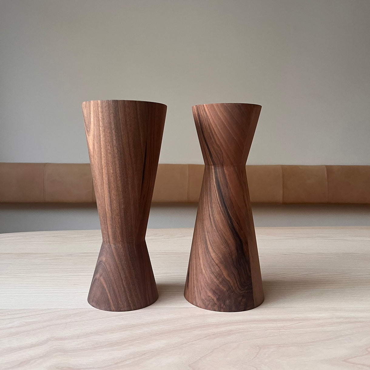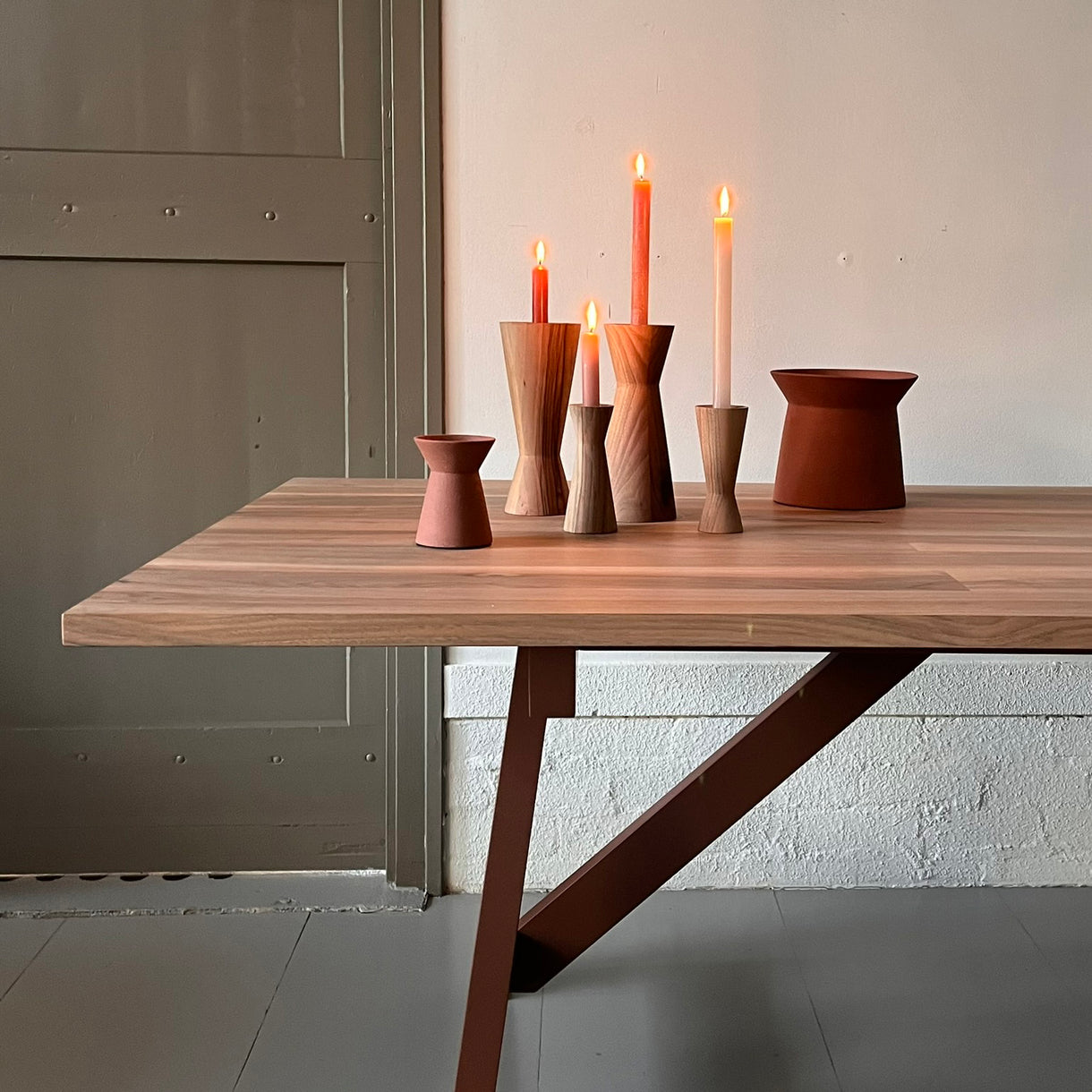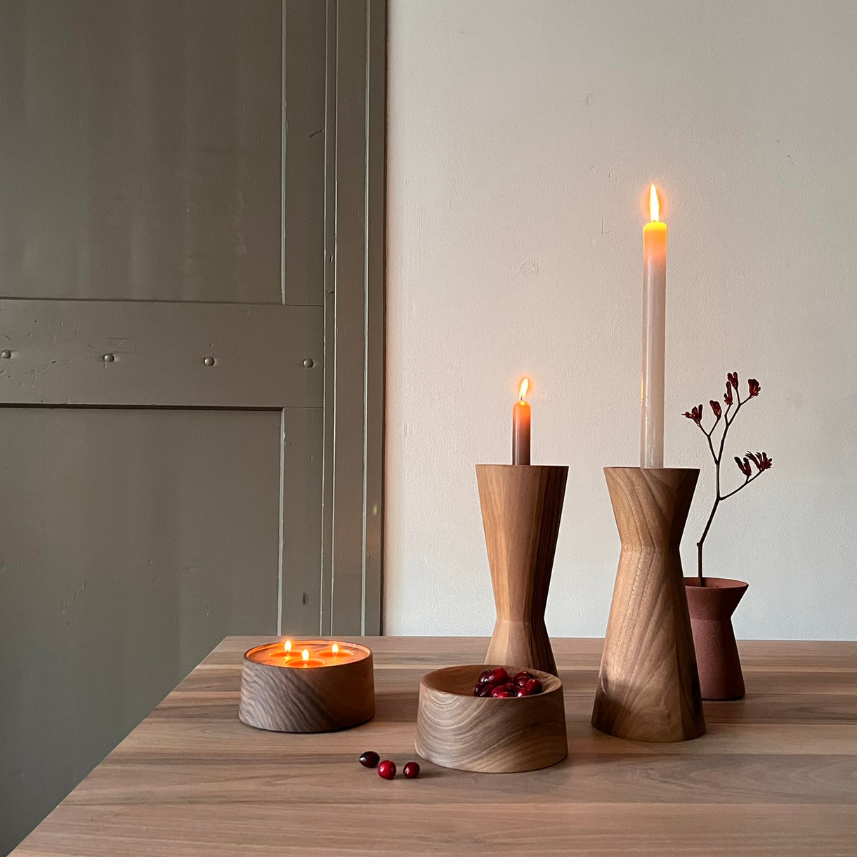 Voor Pilat&Pilat ontwierp Marisa Klaster de DOPPIO serie: een kom, waxinelichthouder en kandelaars groot en klein. De serie draait om eenvoud en speelsheid: elk object heeft een heldere vorm en een dubbele functie. Die combinatie van ‘function and play’ is typerend voor Klaster’s werk. Het gebruik van notenhout geeft de stukken een krachtig, donker silhouet. De producten zijn hand gedraaid in de houtdraaierij in Bosnië.